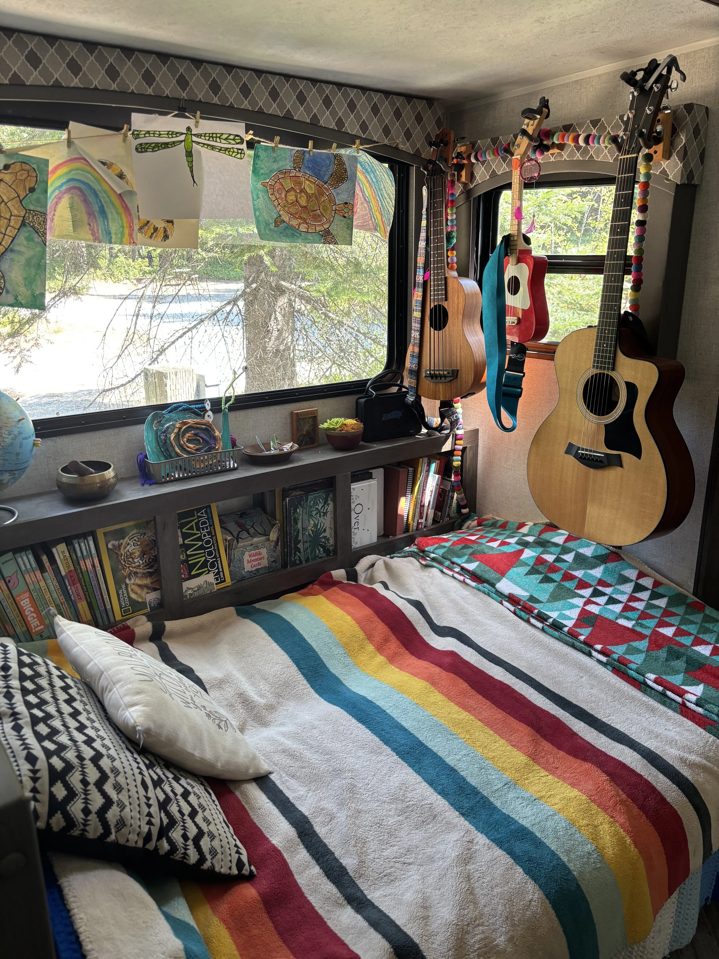 Our art supplies are always accessible and take up a significant portion of the overall storage space in our travel trailer. This kind of open-ended creativity supports fine motor skills, expression, confidence and has inspired both of our sons to become entrepreneurs—they both create and sell their art to neighbors and friends and at local kids markets when we have the opportunity to be part of one.